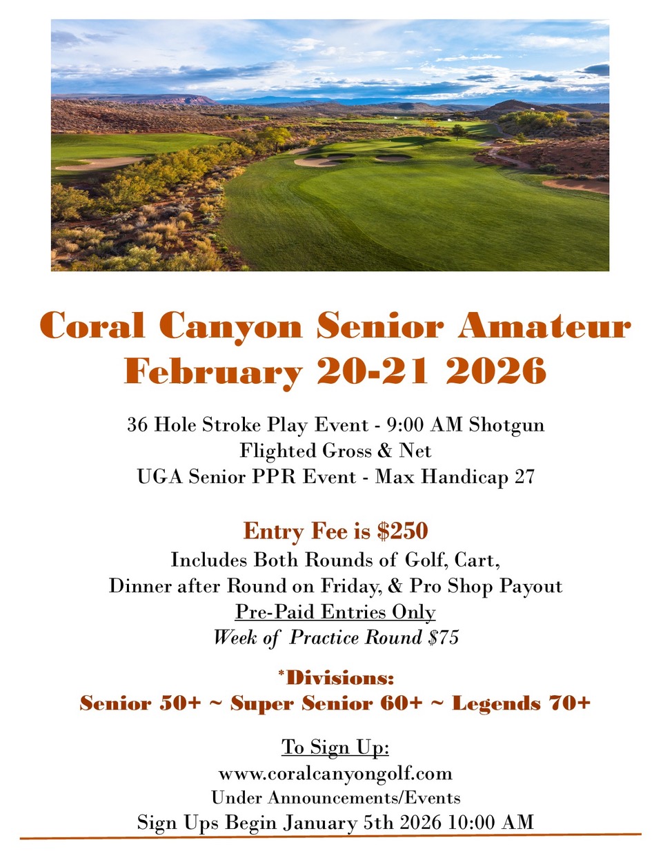 Announcements / Events Upcoming Tournaments 2026 Senior Amateur February 20 – February 21st, 2026 Register Here Download Tournament Flyer December 2 Person Scramble December 6th, 2025 Registration Open Now Register Here 2026 Amateur January 2nd – January 3rd, 2026 Register Here Download Tournament Flyer Superintendent's Revenge Tournament November 1st, 2025 Registration Opens September 13th, 2025 Register Here 1 Person Scramble July 19th, 2025 Register Here 2025 Amateur Tournament January 3rd – January 4th, 2025 Register Here Download Tournament Flyer 2025 Senior Amateur Tournament February 21st – February 22nd, 2025 Register Here Download Tournament Flyer Previous Amateur Tournament Results 2023 Amateur Tournaments – Leaderboard & Scores 2023 Amateur Tournament Leaderboard 2023 One-Person Scramble Leaderboard 2022 Amateur Tournaments – Leaderboard & Scores 2022 Senior Amateur Tournament Leaderboard 2022 Amateur Tournament Scores 2021 Amateur Tournaments – Payouts & Scores 2021 Amateur Tournament Payouts 2021 Amateur Tournament Scores BOOK A TEE TIMETake Your Game to the Next LevelPlay your game hard and try to be aware of what you do. Your life is a kind of sport, don't lose your time, and don't stay away. Book Here